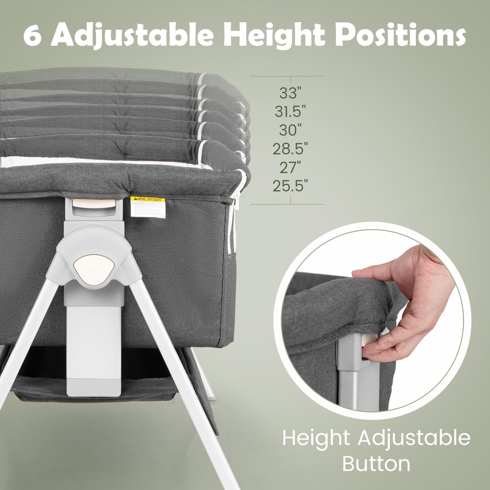- 💺 6 hauteurs réglables : la hauteur du berceau cododo se règle facilement grâce aux boutons situés de chaque côté. Les 6 positions s’adaptent à la majorité des lits adultes. L’inclinaison réglable réduit les risques de régurgitation pour accompagner sereinement la croissance de bébé.