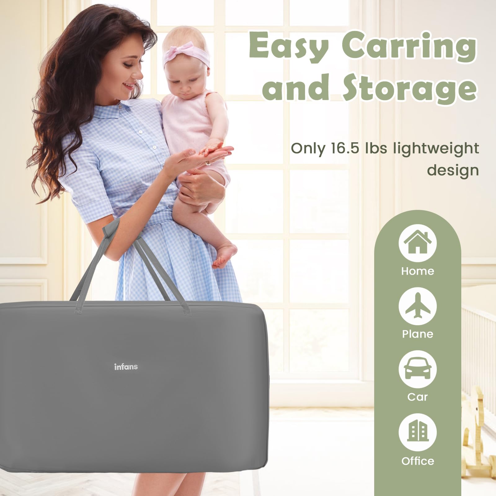 - 📦 Déplacement et rangement faciles : le berceau se démonte pour un stockage compact. Nous fournissons un sac de transport pour l’emporter en voyage. Le châssis pliable intègre des roulettes ; soulevez un côté pour le déplacer. Des patins antidérapants stabilisent la structure lorsqu’elle est posée au sol.
