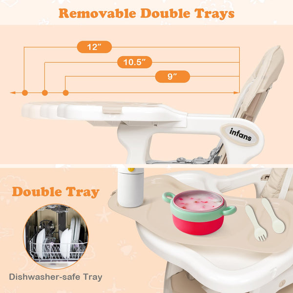- ❤️DOSSIER ET PLATEAUX RÉGLABLES : Le dossier offre 3 positions idéales pour manger, donner à manger ou se détendre. La distance entre le plateau et le dossier se règle de 9 à 12 po (≈23-30 cm) afin de s’adapter à chaque enfant. Cette ergonomie assure un confort optimal.