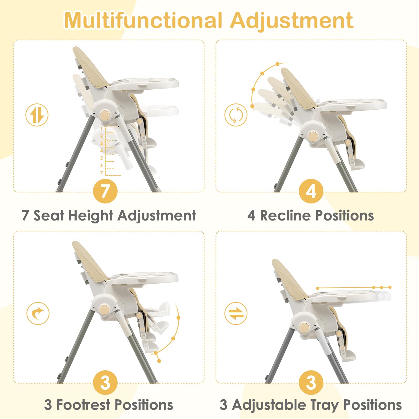 Chaise haute évolutive et pliable pour bébé et enfant, 7 hauteurs, dossier inclinable 4 positions