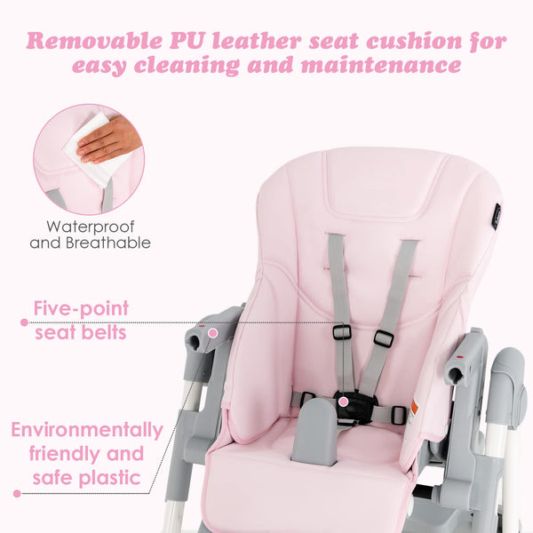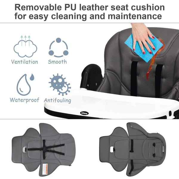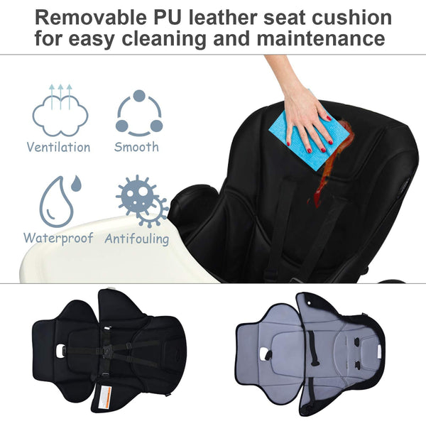 • Nettoyage facile : plateau supérieur en PP passe au lave-vaisselle, coussin en cuir PU imperméable se nettoie d’un coup de chiffon. Harnais de sécurité 5 points et bords arrondis.