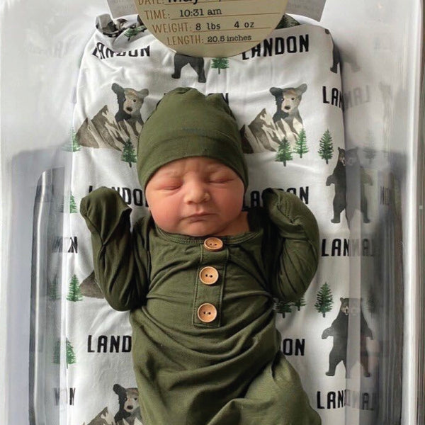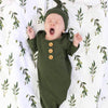 La nuance parfaite de vert olive foncé, l’ensemble idéal pour la sortie de la maternité avec le lange assorti ! Ces grenouillères nouées facilitent le change et maintiennent bébé bien au chaud : il suffit de nouer le bas pour couvrir ses petites jambes. Elles sont également superbes sur les photos de naissance. Si simple ET si confortable !