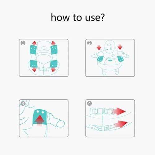 La bouée de natation pour bébé se met facilement sur l'enfant, comme illustré sur l'image ci-dessous. Il suffit d'y glisser les bras du bébé, de boucler et, tada... votre enfant la porte fièrement pour profiter de l'eau et vous éclabousser. 🤗