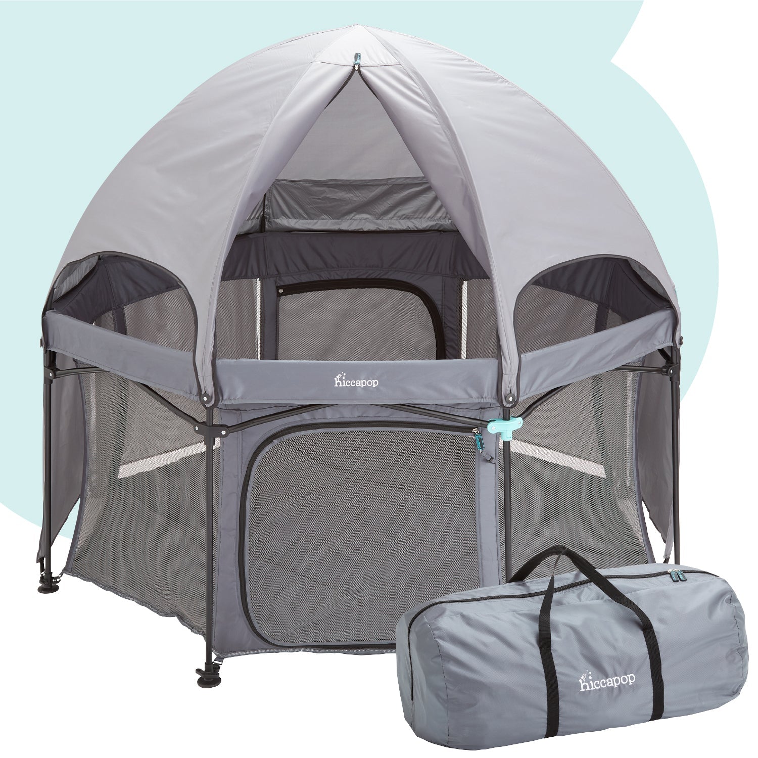 DÔME AVEC 5 PARE-SOLEIL BLOQUE LES RAYONS SOUS TOUS LES ANGLES | Le matériau réfléchissant protège votre enfant tout en gardant le parc PlayPod au frais. Des verrous coupe-vent garantissent que le dôme reste solidement fixé et une fermeture éclair de qualité bagagerie s’ouvre pour accéder facilement à votre bébé par le dessus. Cinq pare-soleil se déplient pour empêcher les rayons de pénétrer sous n’importe quel angle. Le dôme se replie de façon compacte dans son sac de transport qui se glisse dans le sac de transport, également qualité bagagerie, du PlayPod.