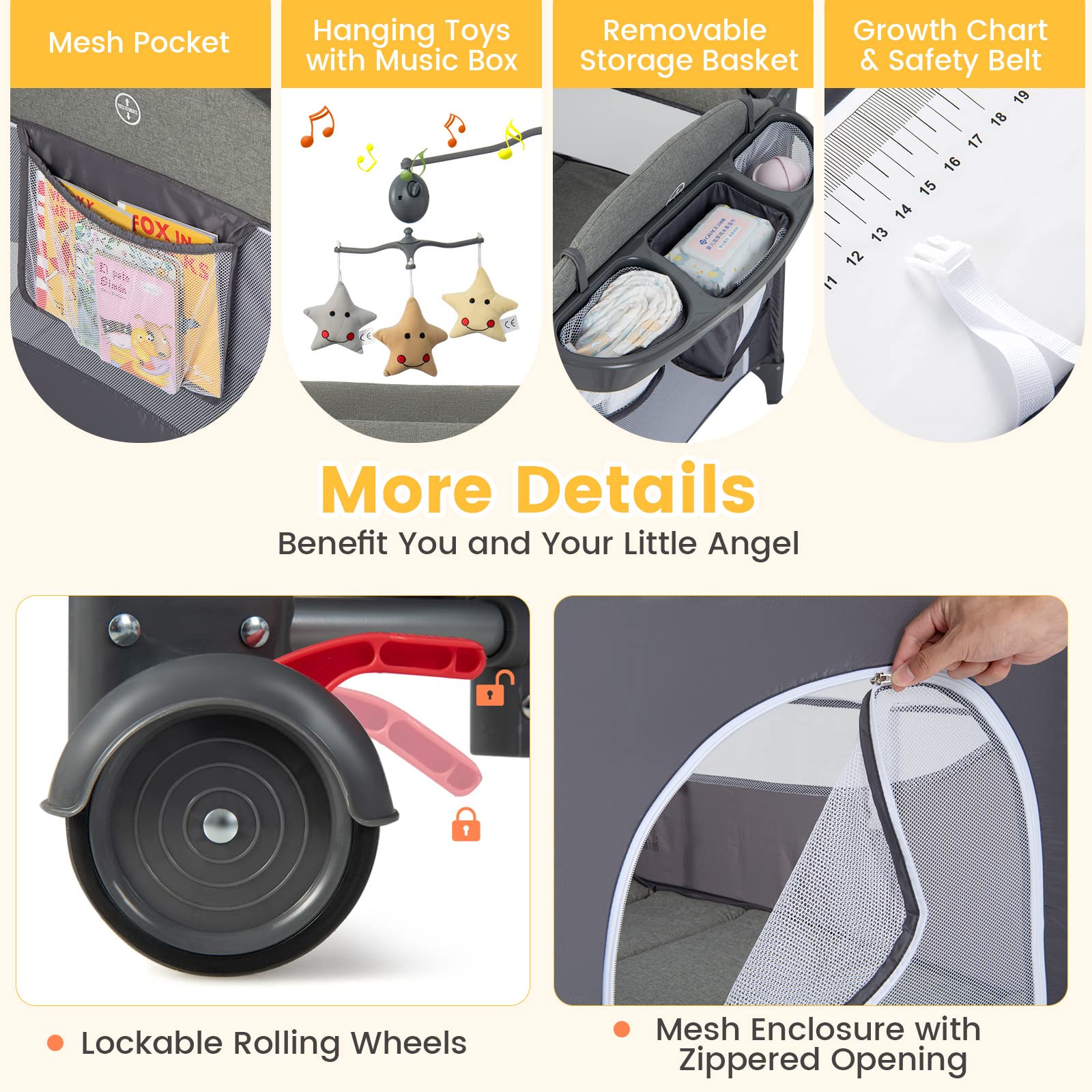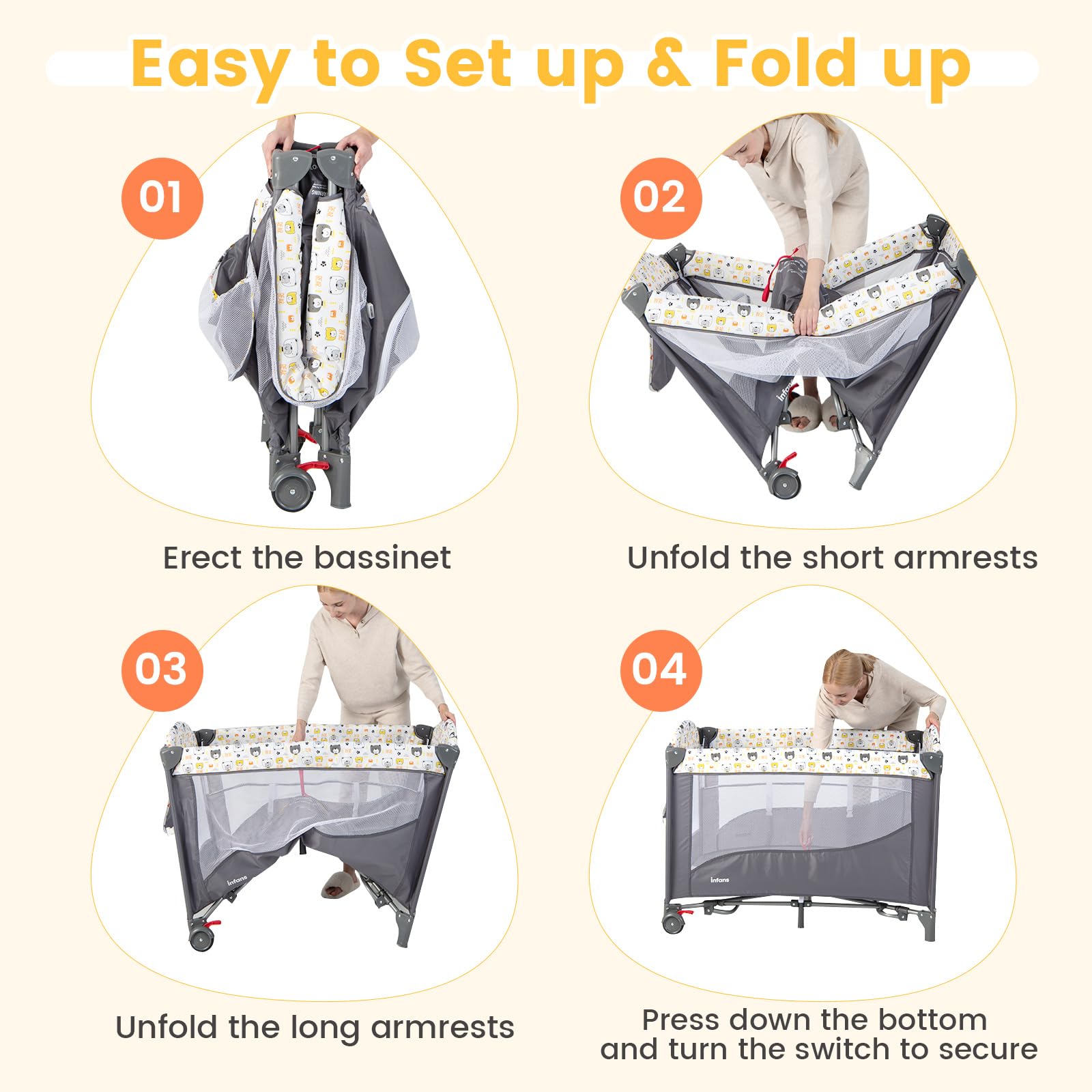 - ❤️ Parc pliable évolutif 5-en-1 : lit d’appoint, table à langer, berceau à bascule, centre d’activités et lit de voyage.
